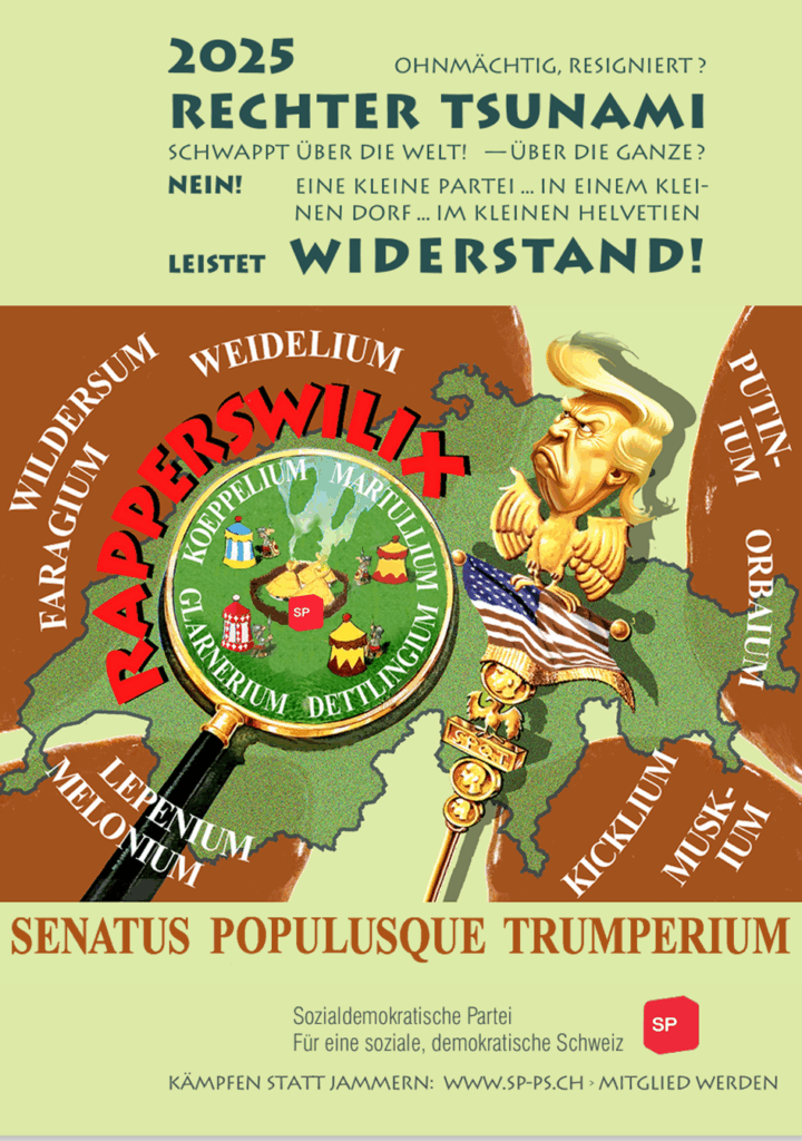 Über alle diese Rechtspopulisten hinaus aber ragt Donaldus aus Trumperium, als Pendant zum Feldherrn Julius Cäsar, der Gallien – heute bekannt als Frankreich – in den Jahren 58 bis 51/50 vor Christus für das Römische Reich erobert hat. Andere SP-Sektionen leisten Widerstand gegen die Bürgerlichen in der eigenen Gemeinde – die SP Rapperswil gegen den “rechten Tsunami” auf der ganzen Welt.