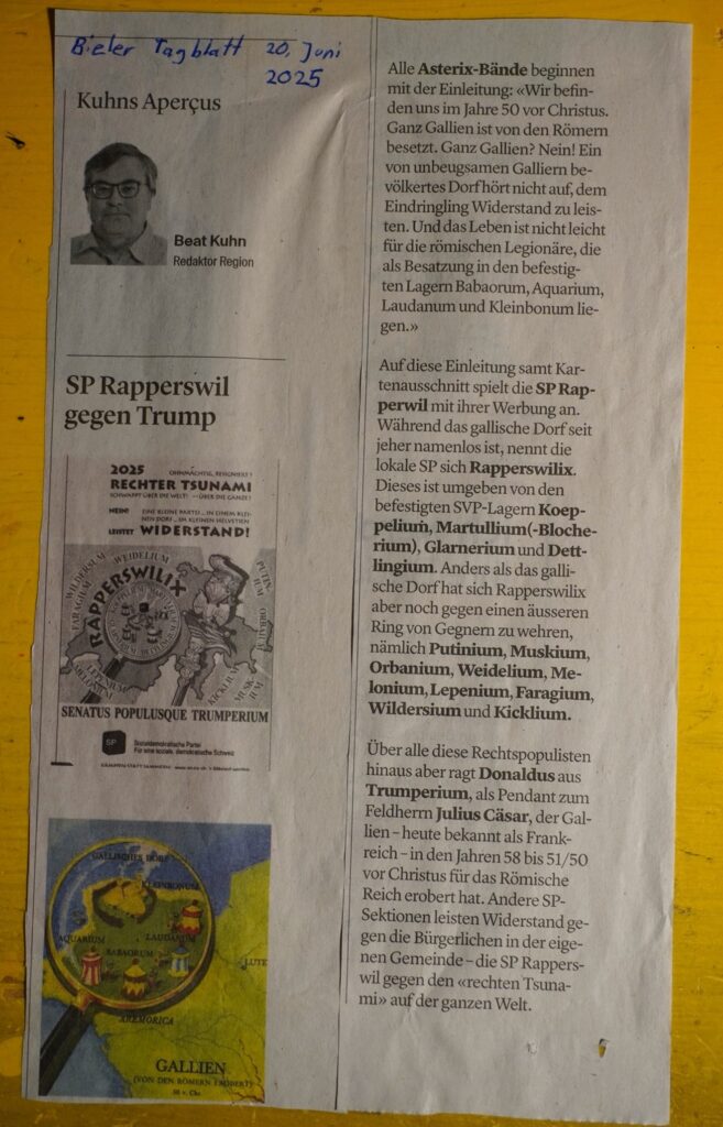Auf diese Einleitung samt Kartenausschnitt spielt die SP Rapperswil mit ihrer Werbung an. Während das gallische Dorf seit jeher namenlos ist, nennt die lokale SP sich Rapperswilix. Dieses ist umgeben von den befestigten SVP-Lagern Koeppelium, Martullium(-Blocherium), Glarnerium und Dettlingium. Andres als das gallische Dorf hat sich Rapperswilix aber noch gegen einen äusseren Ring von Gegnern zu wehren, nämlich Putinium, Muskium, Orbanium, Weidelum, Melonium, Lepenium, Faragium, Wildersium und Kicklium.